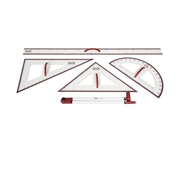 Rinkinį sudaro 2 trikampiai, matlankis, skriestuvas, liniuotė.