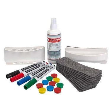 4 vnt. skirtingų spalvų markeriai, vertikalus magnetinis markerių laikiklis, valymo skystis 200 ml, magnetinis valiklis, padeliai valikliui 10 vnt., magnetai D20 10 vnt.
